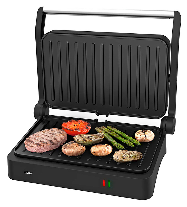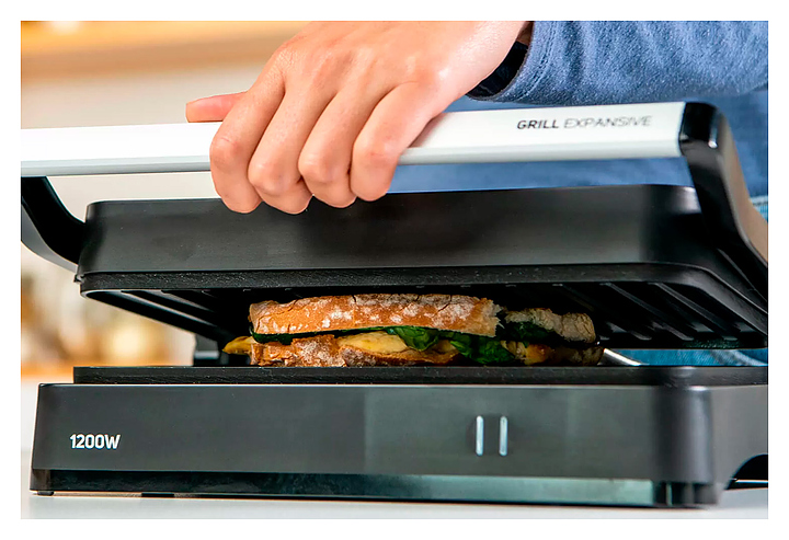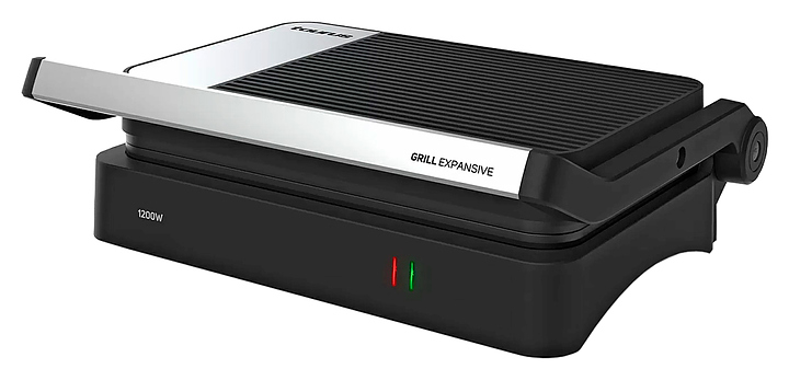 Контактный гриль Taurus Expansive предназначен для жарки мяса, рыбы и овощей в частных домах, квартирах, отелях и офисах. Модель оснащена световыми индикаторами питания и нагрева. Корпус выполнен из пластика с отделкой из нержавеющей стали, жарочные панели с антипригарным покрытием без содержания PFOA. Особенности: