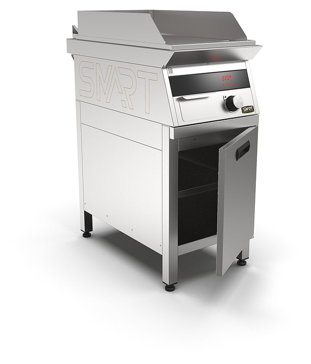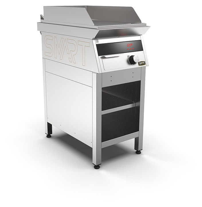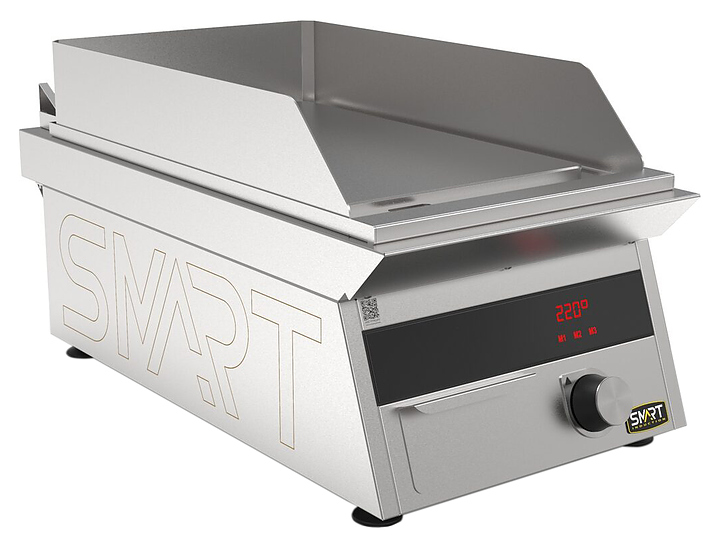 Индукционный гриль SMART INDUCTION G92-PN предназначен для приготовления мясных, рыбных и овощных блюд на предприятиях общественного питания и торговли. Модель оснащена электронно-механической панелью управления с цифровой индикацией и сенсорными кнопками, съемным жировым фильтром для отделения жира и влаги от поступающего внутрь аппарата воздуха, ящиком для сбора жира и регулируемыми по высоте ножками. Корпус и столешница выполнены из нержавеющей стали AISI430, рабочая поверхность и передняя панель - из нержавеющей стали. Особенности: