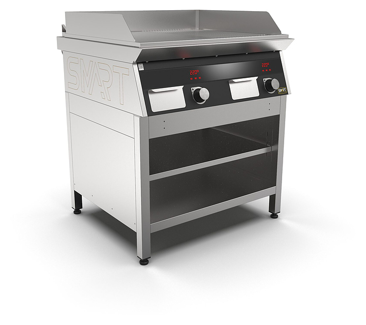 Индукционный гриль SMART INDUCTION G74-PRB предназначен для приготовления мясных, рыбных и овощных блюд на предприятиях общественного питания и торговли. Модель оснащена электронно-механической панелью управления с цифровой индикацией и сенсорными кнопками, съемным жировым фильтром для отделения жира и влаги от поступающего внутрь аппарата воздуха, ящиком для сбора жира и регулируемыми по высоте ножками. Корпус и столешница выполнены из нержавеющей стали AISI430, рабочая поверхность - из нержавеющей стали, передняя панель имеет стойкое полимерное покрытие черного цвета. Особенности: