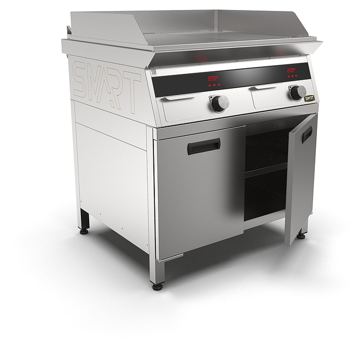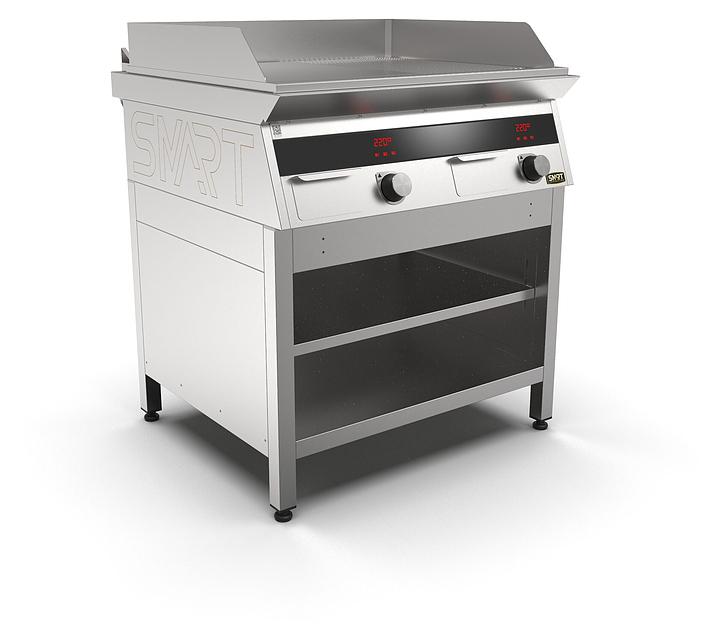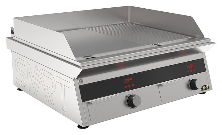 Индукционный гриль SMART INDUCTION G74-PRN предназначен для приготовления мясных, рыбных и овощных блюд на предприятиях общественного питания и торговли. Модель оснащена электронно-механической панелью управления с цифровой индикацией и сенсорными кнопками, съемным жировым фильтром для отделения жира и влаги от поступающего внутрь аппарата воздуха, ящиком для сбора жира и регулируемыми по высоте ножками. Корпус и столешница выполнены из нержавеющей стали AISI430, рабочая поверхность и передняя панель - из нержавеющей стали. Особенности: