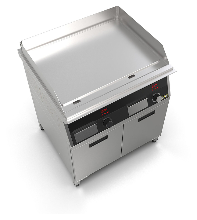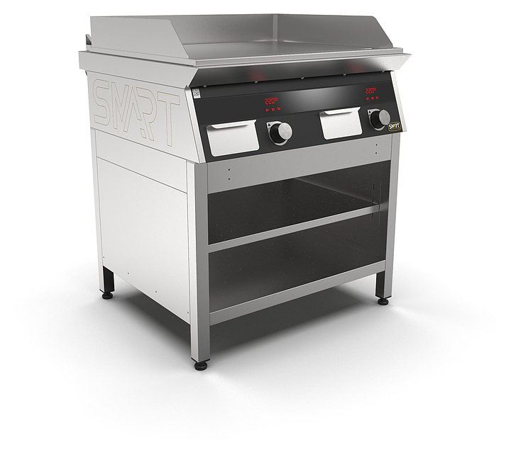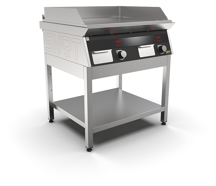 Индукционный гриль SMART INDUCTION G94-PB предназначен для приготовления мясных, рыбных и овощных блюд на предприятиях общественного питания и торговли. Модель оснащена электронно-механической панелью управления с цифровой индикацией и сенсорными кнопками, съемным жировым фильтром для отделения жира и влаги от поступающего внутрь аппарата воздуха, ящиком для сбора жира и регулируемыми по высоте ножками. Корпус и столешница выполнены из нержавеющей стали AISI430, рабочая поверхность - из нержавеющей стали, передняя панель имеет стойкое полимерное покрытие черного цвета. Особенности: