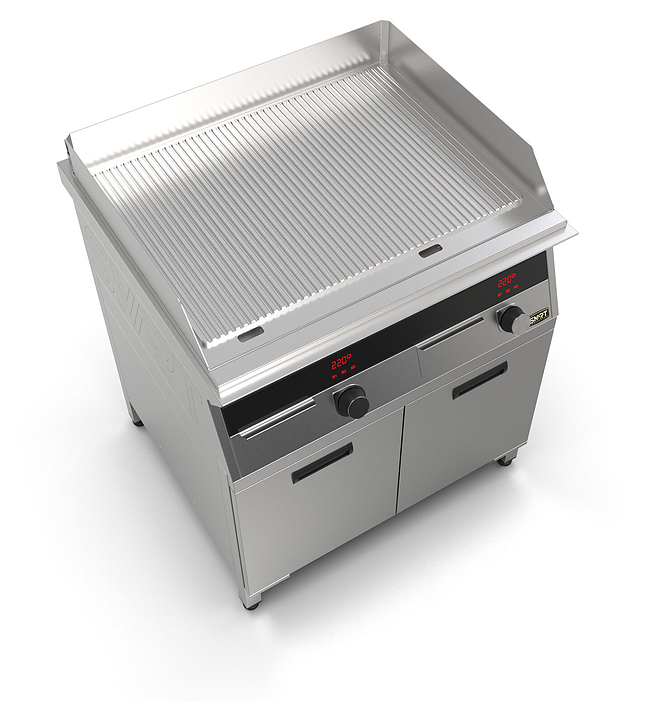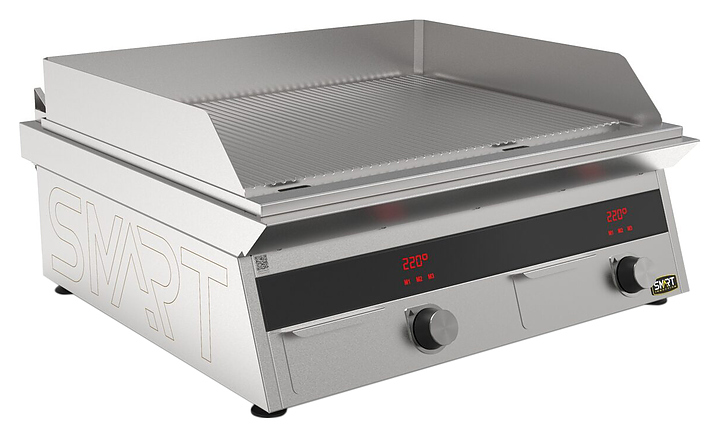 Индукционный гриль SMART INDUCTION G94-RB предназначен для приготовления мясных, рыбных и овощных блюд на предприятиях общественного питания и торговли. Модель оснащена электронно-механической панелью управления с цифровой индикацией и сенсорными кнопками, съемным жировым фильтром для отделения жира и влаги от поступающего внутрь аппарата воздуха, ящиком для сбора жира и регулируемыми по высоте ножками. Корпус и столешница выполнены из нержавеющей стали AISI430, рабочая поверхность и передняя пенель - из нержавеющей стали. Особенности: