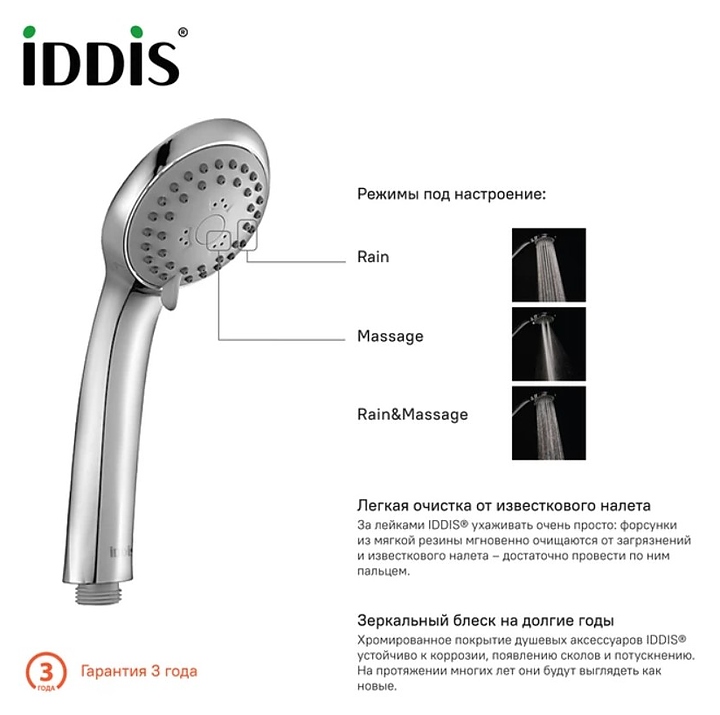 Душевая лейка IDDIS Optima Home A11031 предназначена для использования в ванных комнатах. Изделие выполнено из ABS-пластика с хромированным покрытием, которое устойчиво к коррозии, появлению царапин, сколов и потускнению. Особенности: