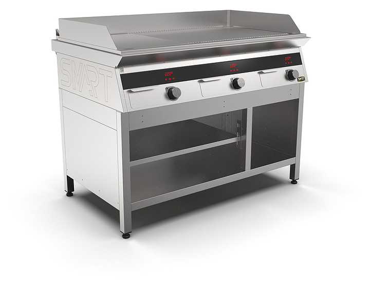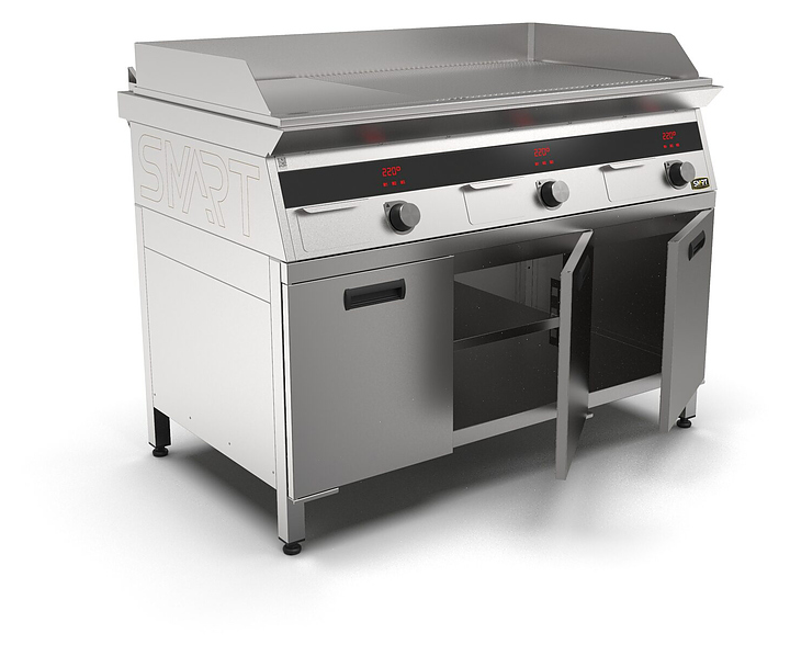 Индукционный гриль SMART INDUCTION G96-PRRN предназначен для приготовления мясных, рыбных и овощных блюд на предприятиях общественного питания и торговли. Модель оснащена электронно-механической панелью управления с цифровой индикацией и сенсорными кнопками, съемным жировым фильтром для отделения жира и влаги от поступающего внутрь аппарата воздуха, ящиком для сбора жира и регулируемыми по высоте ножками. Корпус и столешница выполнены из нержавеющей стали AISI430, рабочая поверхность и передняя панель - из нержавеющей стали. Особенности: