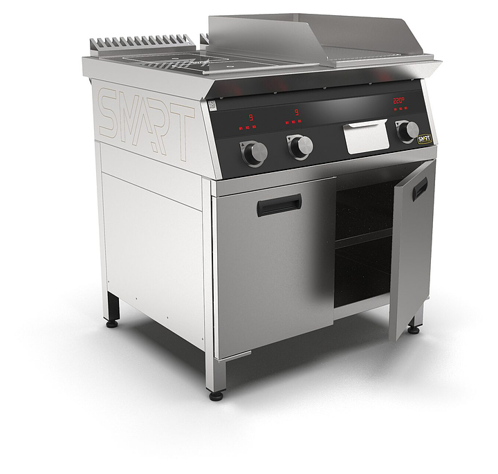 Комбинированная индукционная плита SMART INDUCTION K74-3KRB предназначена для приготовления и быстрого разогрева блюд на предприятиях общественного питания и торговли. Модель оснащена электронно-механической панелью управления с цифровой индикацией и сенсорными кнопками, 2 съемными жировыми фильтрами для отделения жира и влаги от поступающего внутрь аппарата воздуха, ящиком для сбора жира и регулируемыми по высоте ножками. Корпус и столешница выполнены из нержавеющей стали AISI430, рабочая поверхность плиты - из стеклокерамики, рабочая поверхность гриля - из нержавеющей стали, передняя панель имеет стойкое полимерное покрытие черного цвета. Особенности: