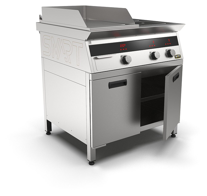Комбинированная индукционная плита SMART INDUCTION K74-3PKN предназначена для приготовления и быстрого разогрева блюд на предприятиях общественного питания и торговли. Модель оснащена электронно-механической панелью управления с цифровой индикацией и сенсорными кнопками, 2 съемными жировыми фильтрами для отделения жира и влаги от поступающего внутрь аппарата воздуха, ящиком для сбора жира и регулируемыми по высоте ножками. Корпус и столешница выполнены из нержавеющей стали AISI430, рабочая поверхность плиты - из стеклокерамики, рабочая поверхность гриля и передняя панель - из нержавеющей стали. Особенности: