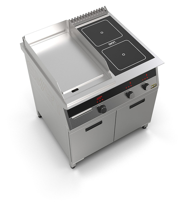 Комбинированная индукционная плита SMART INDUCTION K74-35PKN предназначена для приготовления и быстрого разогрева блюд на предприятиях общественного питания и торговли. Модель оснащена электронно-механической панелью управления с цифровой индикацией и сенсорными кнопками, 2 съемными жировыми фильтрами для отделения жира и влаги от поступающего внутрь аппарата воздуха, ящиком для сбора жира и регулируемыми по высоте ножками. Корпус и столешница выполнены из нержавеющей стали AISI430, рабочая поверхность плиты - из стеклокерамики, рабочая поверхность гриля и передняя панель - из нержавеющей стали. Особенности: