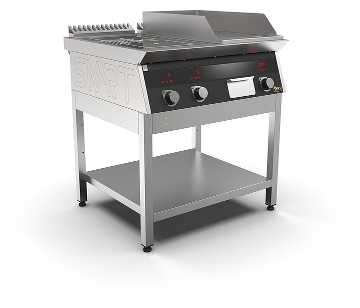 Комбинированная индукционная плита SMART INDUCTION K94-35KPB предназначена для приготовления и быстрого разогрева блюд на предприятиях общественного питания и торговли. Модель оснащена электронно-механической панелью управления с цифровой индикацией и сенсорными кнопками, 2 съемными жировыми фильтрами для отделения жира и влаги от поступающего внутрь аппарата воздуха, ящиком для сбора жира и регулируемыми по высоте ножками. Корпус и столешница выполнены из нержавеющей стали AISI430, рабочая поверхность плиты - из стеклокерамики, рабочая поверхность гриля - из нержавеющей стали, передняя панель имеет стойкое полимерное покрытие черного цвета. Особенности: