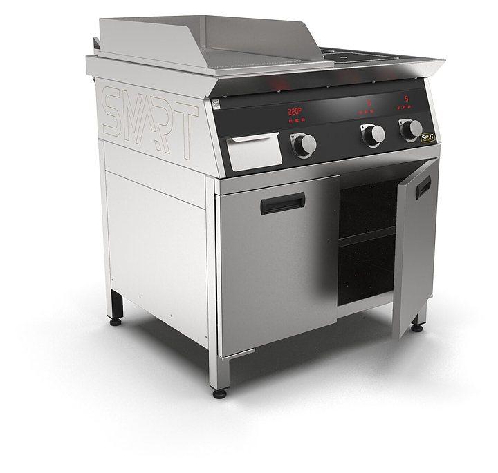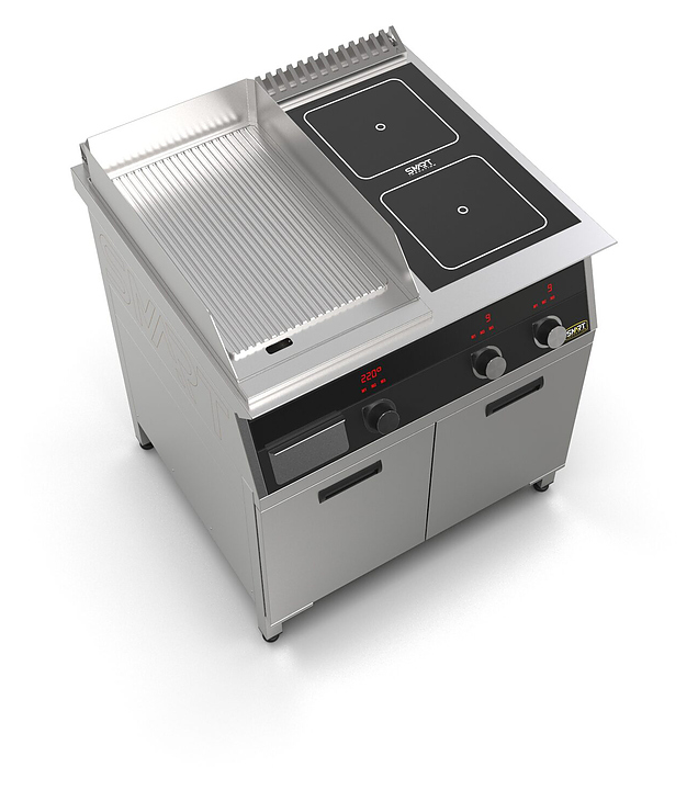 Комбинированная индукционная плита SMART INDUCTION K94-35RKB предназначена для приготовления и быстрого разогрева блюд на предприятиях общественного питания и торговли. Модель оснащена электронно-механической панелью управления с цифровой индикацией и сенсорными кнопками, 2 съемными жировыми фильтрами для отделения жира и влаги от поступающего внутрь аппарата воздуха, ящиком для сбора жира и регулируемыми по высоте ножками. Корпус и столешница выполнены из нержавеющей стали AISI430, рабочая поверхность плиты - из стеклокерамики, рабочая поверхность гриля - из нержавеющей стали, передняя панель имеет стойкое полимерное покрытие черного цвета. Особенности: