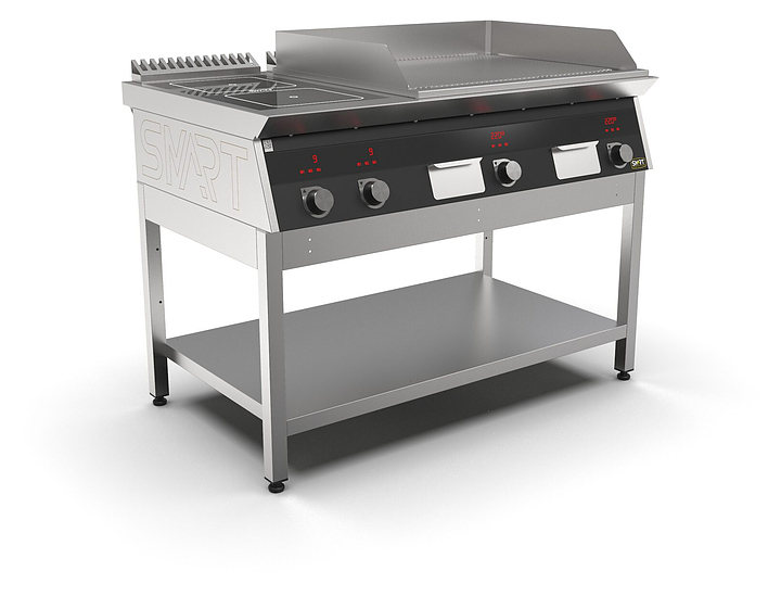 Комбинированная индукционная плита SMART INDUCTION K76-35KRRB предназначена для приготовления и быстрого разогрева блюд на предприятиях общественного питания и торговли. Модель оснащена электронно-механической панелью управления с цифровой индикацией и сенсорными кнопками, 3 съемными жировыми фильтрами для отделения жира и влаги от поступающего внутрь аппарата воздуха, 2 ящиками для сбора жира и регулируемыми по высоте ножками. Корпус и столешница выполнены из нержавеющей стали AISI430, рабочая поверхность плиты - из стеклокерамики, рабочая поверхность гриля - из нержавеющей стали, передняя панель имеет стойкое полимерное покрытие черного цвета. Особенности: