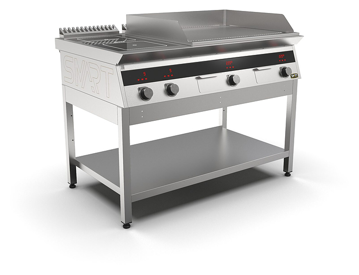 Комбинированная индукционная плита SMART INDUCTION K76-35KRRN предназначена для приготовления и быстрого разогрева блюд на предприятиях общественного питания и торговли. Модель оснащена электронно-механической панелью управления с цифровой индикацией и сенсорными кнопками, 3 съемными жировыми фильтрами для отделения жира и влаги от поступающего внутрь аппарата воздуха, 2 ящиками для сбора жира и регулируемыми по высоте ножками. Корпус и столешница выполнены из нержавеющей стали AISI430, рабочая поверхность плиты - из стеклокерамики, рабочая поверхность гриля и передняя панель - из нержавеющей стали. Особенности: