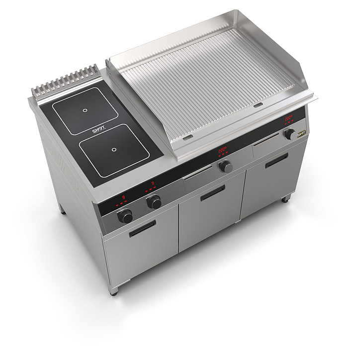 Комбинированная индукционная плита SMART INDUCTION K76-5KRRN предназначена для приготовления и быстрого разогрева блюд на предприятиях общественного питания и торговли. Модель оснащена электронно-механической панелью управления с цифровой индикацией и сенсорными кнопками, 3 съемными жировыми фильтрами для отделения жира и влаги от поступающего внутрь аппарата воздуха, 2 ящиками для сбора жира и регулируемыми по высоте ножками. Корпус и столешница выполнены из нержавеющей стали AISI430, рабочая поверхность плиты - из стеклокерамики, рабочая поверхность гриля и передняя панель - из нержавеющей стали. Особенности: