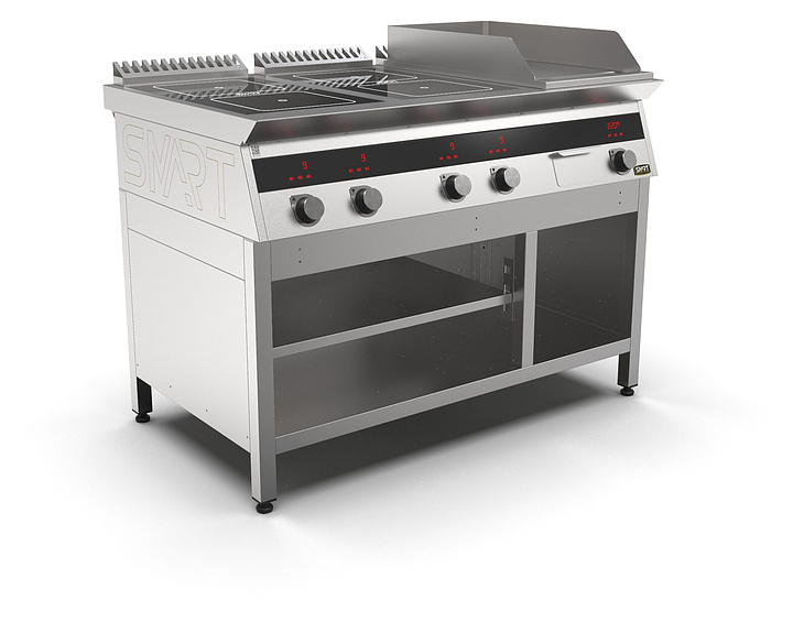 Комбинированная индукционная плита SMART INDUCTION K96-5KPN предназначена для приготовления и быстрого разогрева блюд на предприятиях общественного питания и торговли. Модель оснащена электронно-механической панелью управления с цифровой индикацией и сенсорными кнопками, 3 съемными жировыми фильтрами для отделения жира и влаги от поступающего внутрь аппарата воздуха, 2 ящиками для сбора жира и регулируемыми по высоте ножками. Корпус и столешница выполнены из нержавеющей стали AISI430, рабочая поверхность плиты - из стеклокерамики, рабочая поверхность гриля и передняя панель - из нержавеющей стали. Особенности: