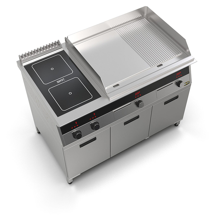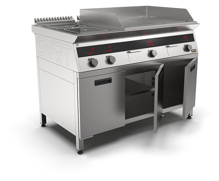 Комбинированная индукционная плита SMART INDUCTION K96-3KPRN предназначена для приготовления и быстрого разогрева блюд на предприятиях общественного питания и торговли. Модель оснащена электронно-механической панелью управления с цифровой индикацией и сенсорными кнопками, 3 съемными жировыми фильтрами для отделения жира и влаги от поступающего внутрь аппарата воздуха, 2 ящиками для сбора жира и регулируемыми по высоте ножками. Корпус и столешница выполнены из нержавеющей стали AISI430, рабочая поверхность плиты - из стеклокерамики, рабочая поверхность гриля и передняя панель - из нержавеющей стали. Особенности: