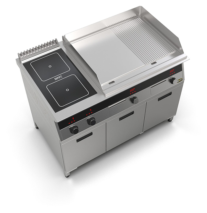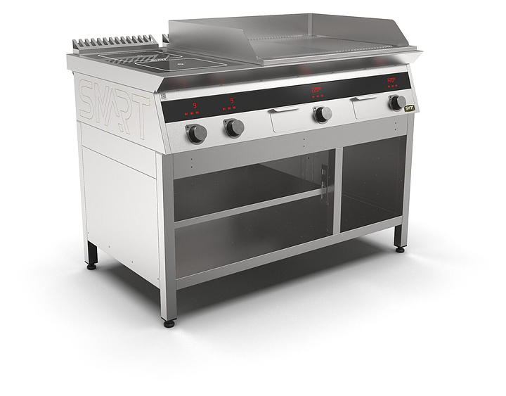 Комбинированная индукционная плита SMART INDUCTION K96-35KPRN предназначена для приготовления и быстрого разогрева блюд на предприятиях общественного питания и торговли. Модель оснащена электронно-механической панелью управления с цифровой индикацией и сенсорными кнопками, 3 съемными жировыми фильтрами для отделения жира и влаги от поступающего внутрь аппарата воздуха, 2 ящиками для сбора жира и регулируемыми по высоте ножками. Корпус и столешница выполнены из нержавеющей стали AISI430, рабочая поверхность плиты - из стеклокерамики, рабочая поверхность гриля и передняя панель - из нержавеющей стали. Особенности: