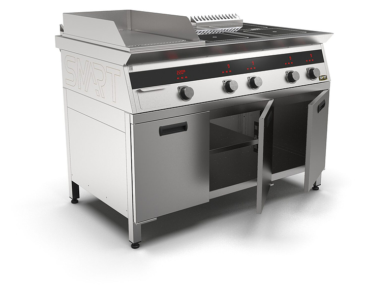 Комбинированная индукционная плита SMART INDUCTION K76-5RKN предназначена для приготовления и быстрого разогрева блюд на предприятиях общественного питания и торговли. Модель оснащена электронно-механической панелью управления с цифровой индикацией и сенсорными кнопками, 3 съемными жировыми фильтрами для отделения жира и влаги от поступающего внутрь аппарата воздуха, 2 ящиками для сбора жира и регулируемыми по высоте ножками. Корпус и столешница выполнены из нержавеющей стали AISI430, рабочая поверхность плиты - из стеклокерамики, рабочая поверхность гриля и передняя панель - из нержавеющей стали. Особенности: