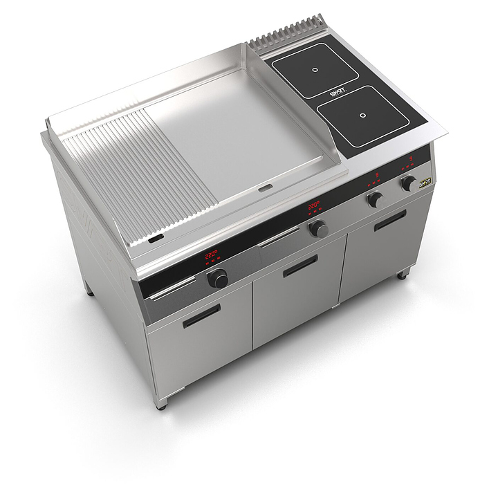 Комбинированная индукционная плита SMART INDUCTION K76-5RPKN предназначена для приготовления и быстрого разогрева блюд на предприятиях общественного питания и торговли. Модель оснащена электронно-механической панелью управления с цифровой индикацией и сенсорными кнопками, 3 съемными жировыми фильтрами для отделения жира и влаги от поступающего внутрь аппарата воздуха, 2 ящиками для сбора жира и регулируемыми по высоте ножками. Корпус и столешница выполнены из нержавеющей стали AISI430, рабочая поверхность плиты - из стеклокерамики, рабочая поверхность гриля и передняя панель - из нержавеющей стали. Особенности: