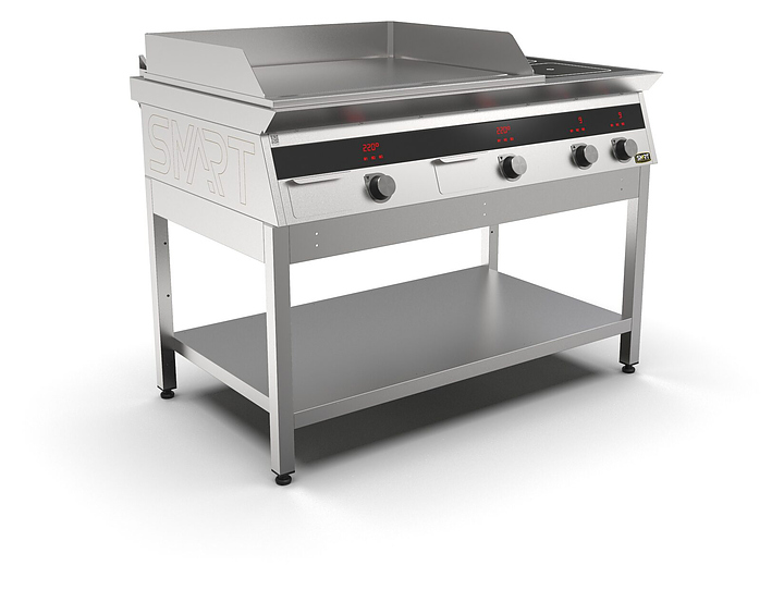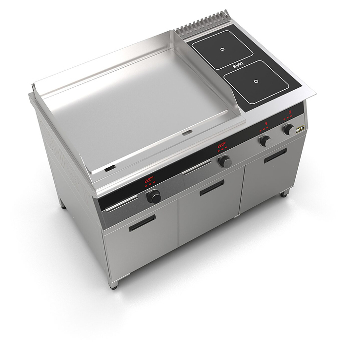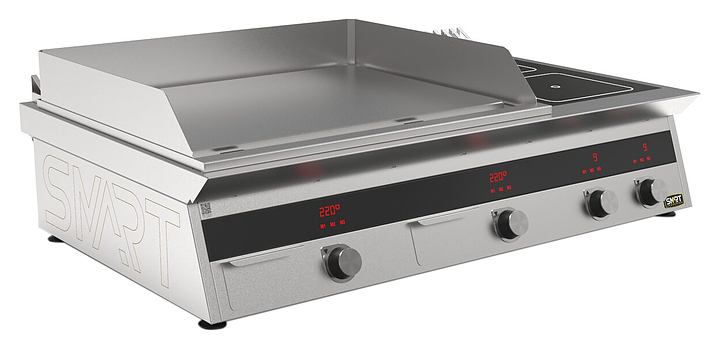 Комбинированная индукционная плита SMART INDUCTION K96-3PPKN предназначена для приготовления и быстрого разогрева блюд на предприятиях общественного питания и торговли. Модель оснащена электронно-механической панелью управления с цифровой индикацией и сенсорными кнопками, 3 съемными жировыми фильтрами для отделения жира и влаги от поступающего внутрь аппарата воздуха, 2 ящиками для сбора жира и регулируемыми по высоте ножками. Корпус и столешница выполнены из нержавеющей стали AISI430, рабочая поверхность плиты - из стеклокерамики, рабочая поверхность гриля и передняя панель - из нержавеющей стали. Особенности: