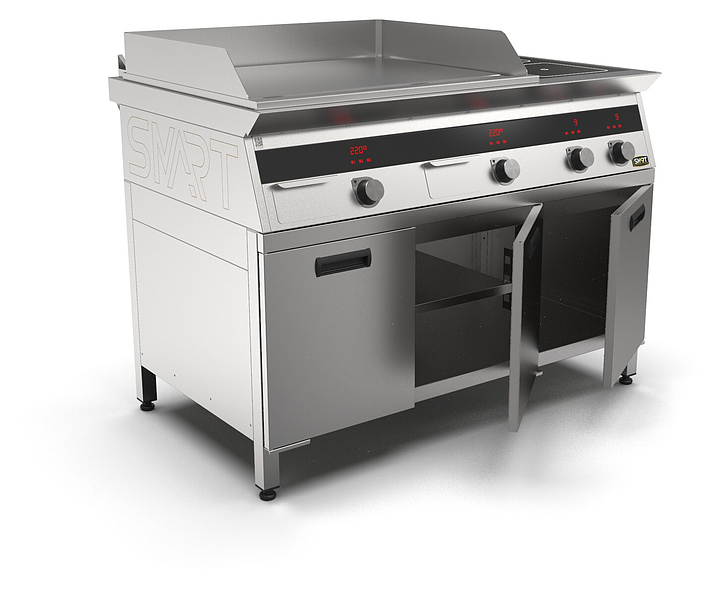 Комбинированная индукционная плита SMART INDUCTION K96-5PPKN предназначена для приготовления и быстрого разогрева блюд на предприятиях общественного питания и торговли. Модель оснащена электронно-механической панелью управления с цифровой индикацией и сенсорными кнопками, 3 съемными жировыми фильтрами для отделения жира и влаги от поступающего внутрь аппарата воздуха, 2 ящиками для сбора жира и регулируемыми по высоте ножками. Корпус и столешница выполнены из нержавеющей стали AISI430, рабочая поверхность плиты - из стеклокерамики, рабочая поверхность гриля и передняя панель - из нержавеющей стали. Особенности: