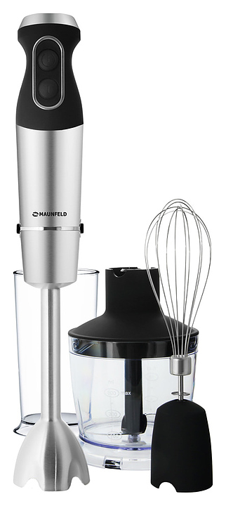 Блендер Maunfeld MHBL.1000S предназначен для взбивания жидкого теста, кремов и коктейлей, измельчения фруктов, овощей, орехов и трав, а также приготовления соусов и супов-пюре в домашних условиях. Модель оснащена рукояткой обтекаемой формы с удобно расположенными функциональными кнопками. Корпус и основная насадка выполнены из нержавеющей стали с сатинированной поверхностью, головка венчика и ножи измельчителя – из высококачественной нержавеющей стали, стакан и контейнер измельчителя – из прозрачного пластика, адаптер венчика и крышка измельчителя – из пластика черного цвета. Комплектация:
