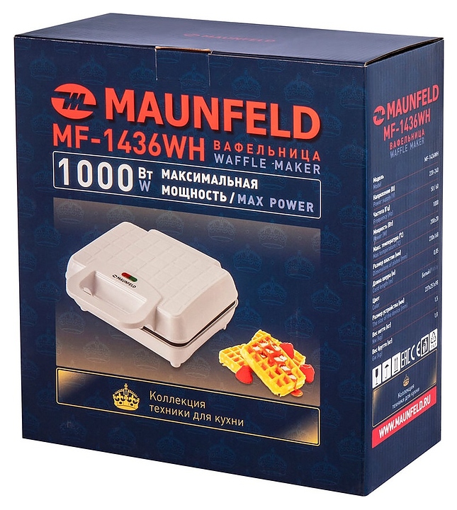 Вафельница Maunfeld MF-1436WH используется в домашних условиях для приготовления бельгийских вафель прямоугольной формы. Модель оснащена 2 рабочими пластинами и кабелем питания с вилкой. Корпус выполнен из прочного пластика белого цвета, рабочие пластины – из металла, упаковка – картонная коробка. В комплект поставки входят инструкция по эксплуатации и гарантийный талон. Особенности: