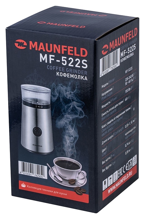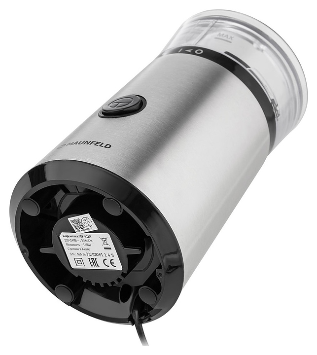 Кофемолка Maunfeld MF-522S предназначена для приготовления молотого кофе из зерен в домашних условиях. Модель оснащена кабелем питания с вилкой, съемными бункером и крышкой. Корпус цилиндрической формы выполнен из нержавеющей стали с сатинированной поверхностью, нож и основание бункера – из высококачественной нержавеющей стали, основание и верхняя часть корпуса – из черного пластика. Особенности: