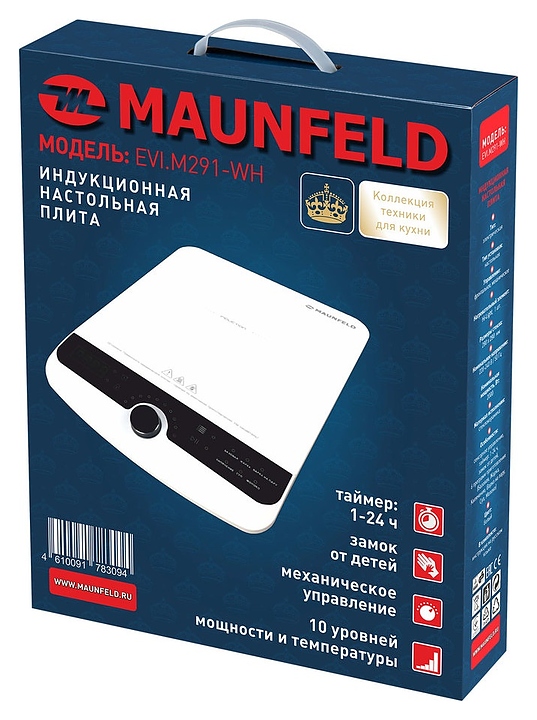 Настольная электрическпя индукционная плита Maunfeld EVI.M291-WH предназначена для приготовления и быстрого разогрева блюд в отелях, офисах и домашних условиях. Принцип работы основан на непосредственном нагреве металлической посуды создаваемыми высокочастотным магнитным полем индуцированными вихревыми токами. Модель оснащена 1 варочной зоной, кабелем питания с вилкой, электромеханической панелью управления с поворотным переключателем, сигнальными лампами и цифровым дисплеем с индикацией красного цвета. Корпус выполнен из нержавеющей стали, рабочая поверхность – из стеклокерамики белого цвета. В комплект поставки входят инструкция по эксплуатации и гарантийный талон. Особенности: