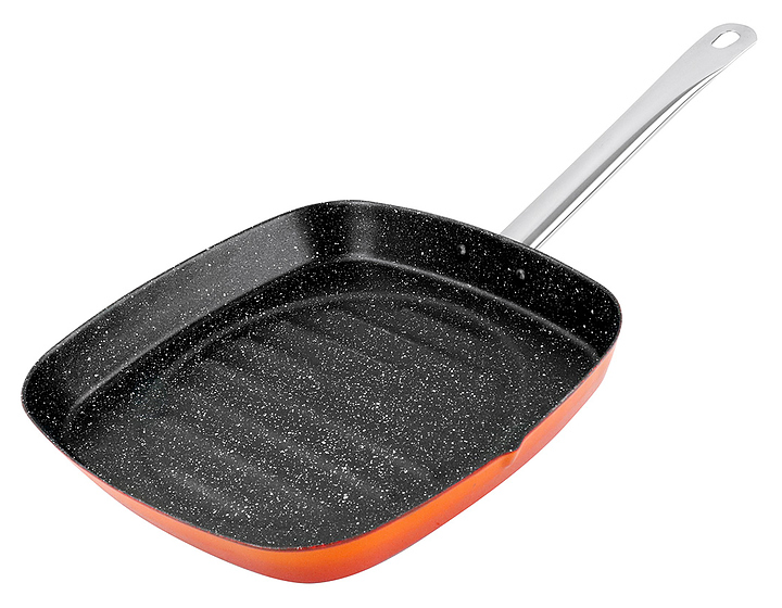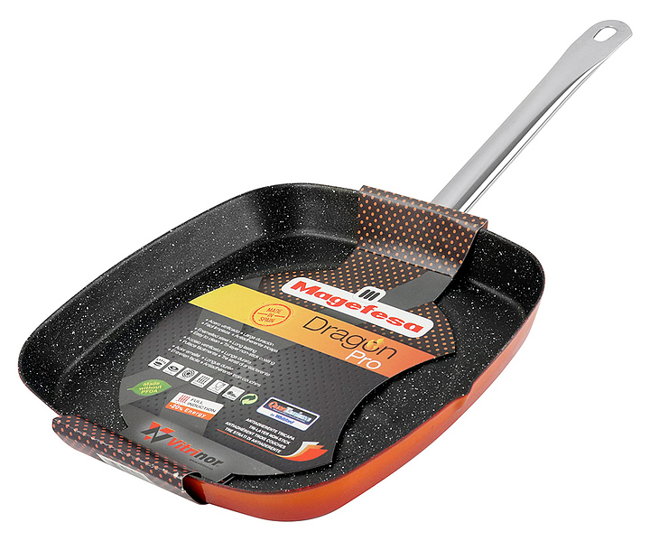 Сковорода-гриль Vitrinor Dragon Piedra Grill 28 используется на предприятиях общественного питания и торговли, а также в домашних условиях для приготовления широкого спектра блюд на любых типах варочных поверхностей, включая индукционные. Модель оснащена эргономичной ручкой с отверстием для подвешивания. Изделие выполнено из стали c ферромагнитными свойствами с трехслойным антипригарным покрытием, не содержащим PFOA, внешнее покрытие - двухслойная стеклоэмаль, обожженная при температуре 820 °С, оранжевого цвета, ручка - из нержавеющей стали. Особенности: