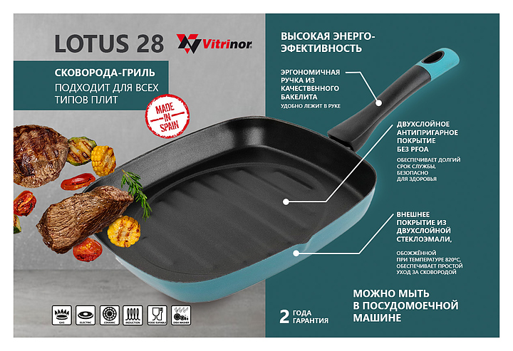 Сковорода-гриль Vitrinor Lotus 28 используется на предприятиях общественного питания и торговли, а также в домашних условиях для приготовления широкого спектра блюд на любых типах варочных поверхностей, включая индукционные. Модель оснащена эргономичной ручкой с отверстием для подвешивания. Изделие выполнено из стали c ферромагнитными свойствами с двухслойным антипригарным покрытием, не содержащим PFOA, внешнее покрытие - двухслойная стеклоэмаль, обожженная при температуре 820 °С, бирюзового цвета, ручка - из бакелита. Особенности: