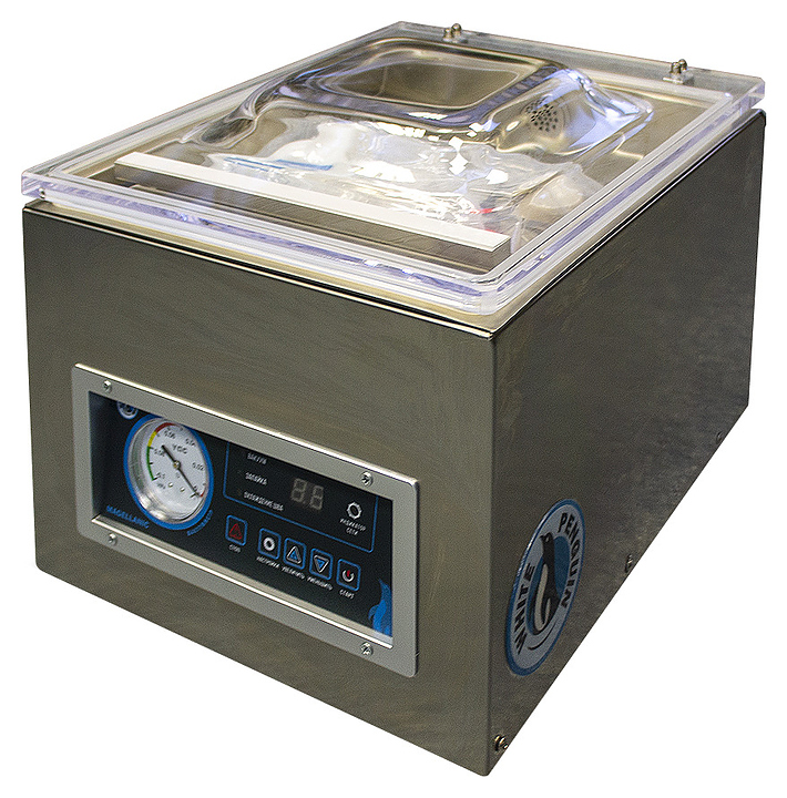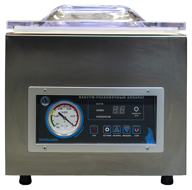 Вакуумный упаковщик White Penguin MAGELLANIC WPC-260T используется на предприятиях общественного питания и торговли для упаковки готовых блюд и пищевых продуктов в герметичную тару для сохранения свежести, предотвращения размножения микроорганизмов и смешивания запахов. Модель оснащена камерой с 1 сварочной пластиной, расположенной сверху откидной крышкой и фирменной панелью управления с функциональными клавишами, цифровым дисплеем, аналоговым вакуумметром и русскоязычным интерфейсом. Корпус выполнен из нержавеющей стали марки 201, камера – из нержавеющей стали марки 304. В комплект поставки входят набор необходимых запчастей и вакуумное масло. Особенности: