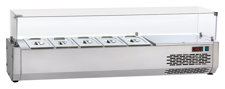 Холодильная витрина Tecnodom VR4140VD используется на предприятиях общественного питания и торговли для охлаждения и кратковременного хранения салатов, закусок, ингредиентов для пиццы. Модель оснащена защитным экраном из закаленного стекла. Корпус выполнен из нержавеющей стали. Витрина используется совместно со столом Tecnodom SLV02C6. Гастроемкости в комплект поставки не входят и приобретаются отдельно. Особенности: