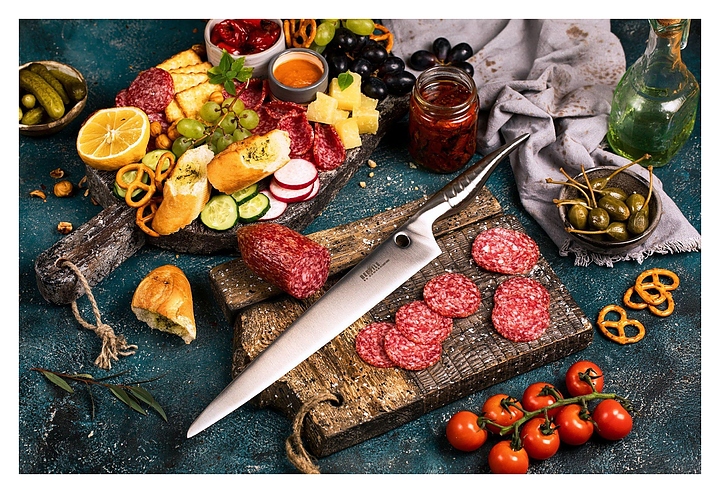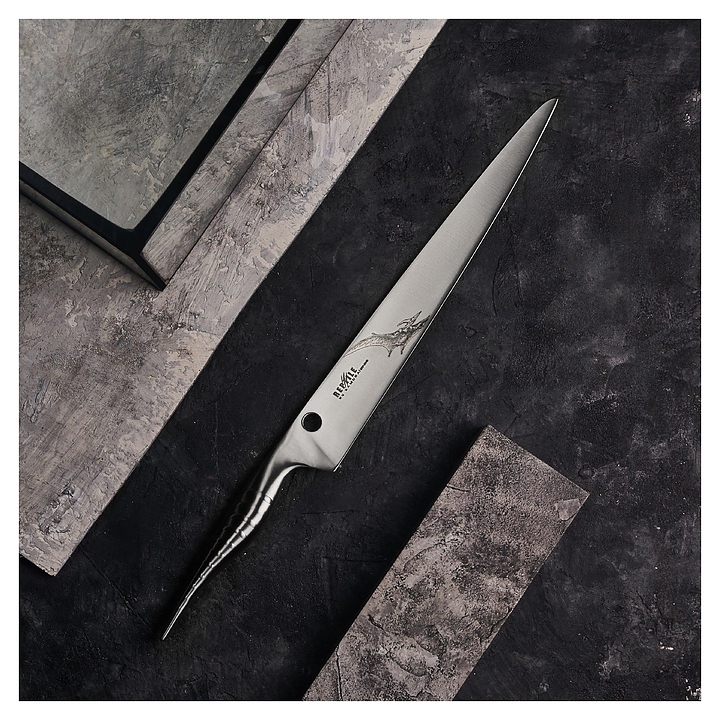 Нож Samura Reptile SRP-0045 предназначен для нарезки филе, рыбных и мясных деликатесов, ветчины, хамона и других продуктов на предприятиях общественного питания и торговли, в частных домах и квартирах. Лезвие выполнено из коррозионно-стойкой однослойной стали AUS-10, ручка - из стали. Особенности: