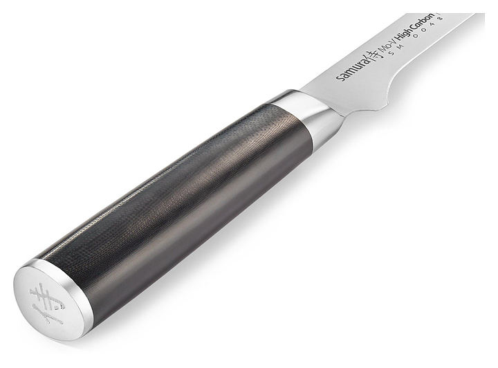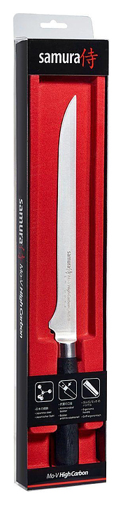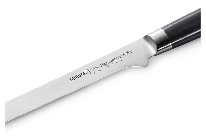 Японский кухонный нож Samura Mo-V SM-0048 предназначен для тонкой нарезки и филирования рыбы или мяса на предприятиях общественного питания и торговли, в частных домах и квартирах. Особая форма и гибкость лезвия позволяют с легкостью "обходить" даже очень крупные суставы. Лезвие выполнено из коррозионно-стойкой однослойной стали AUS-8, ручка - из стеклоткани G-10. Особенности: