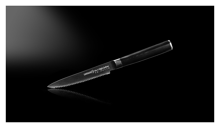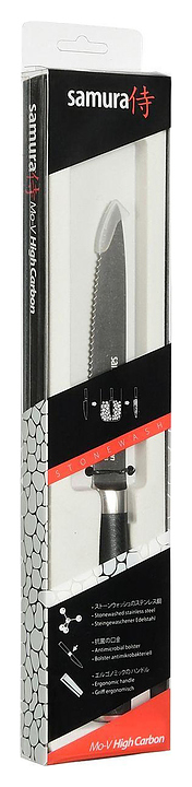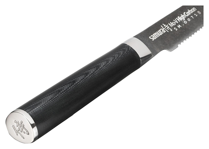 Японский кухонный нож Samura Mo-V Stonewash SM-0071B предназначен для нарезки помидоров, а также других мягких овощей и фруктов на предприятиях общественного питания и торговли, в частных домах и квартирах. Клинок имеет мелкие, острые зубчики. Лезвие выполнено из коррозионно-стойкой однослойной стали AUS-8 и имеет матовую грубую поверхность благодаря обработке методом галтовки, ручка - из стеклоткани G-10. Особенности: