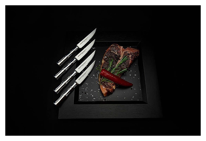 Японский кухонный нож Samura Bamboo SBA-0031 предназначен для нарезки стейков, мяса и пиццы на предприятиях общественного питания и торговли, в частных домах и квартирах. Рукоять сделана в виде бамбукового стебля, без швов. Лезвие и ручка выполнены из коррозионно-стойкой молибдено-ванадиевой однослойной стали AUS-8. Особенности: