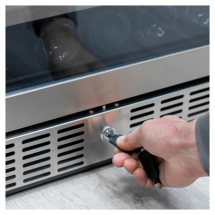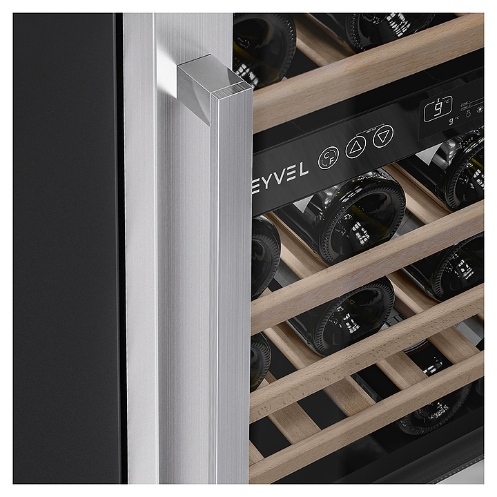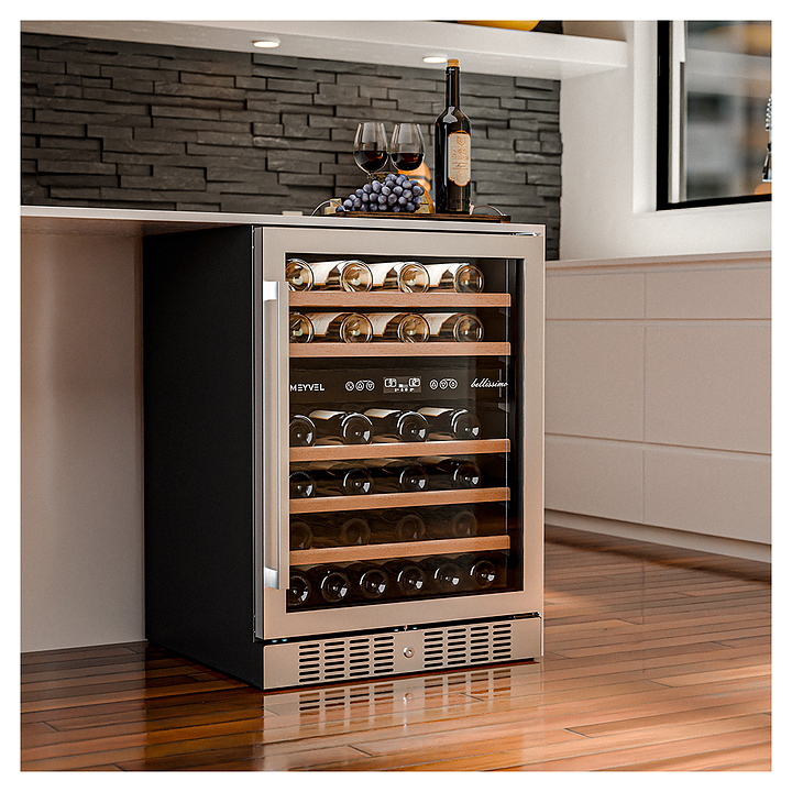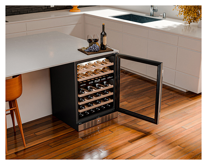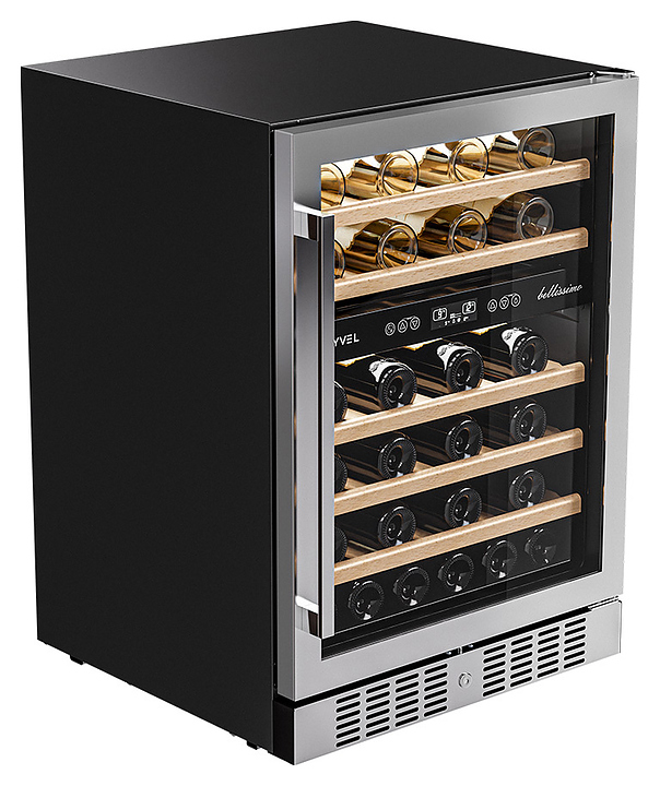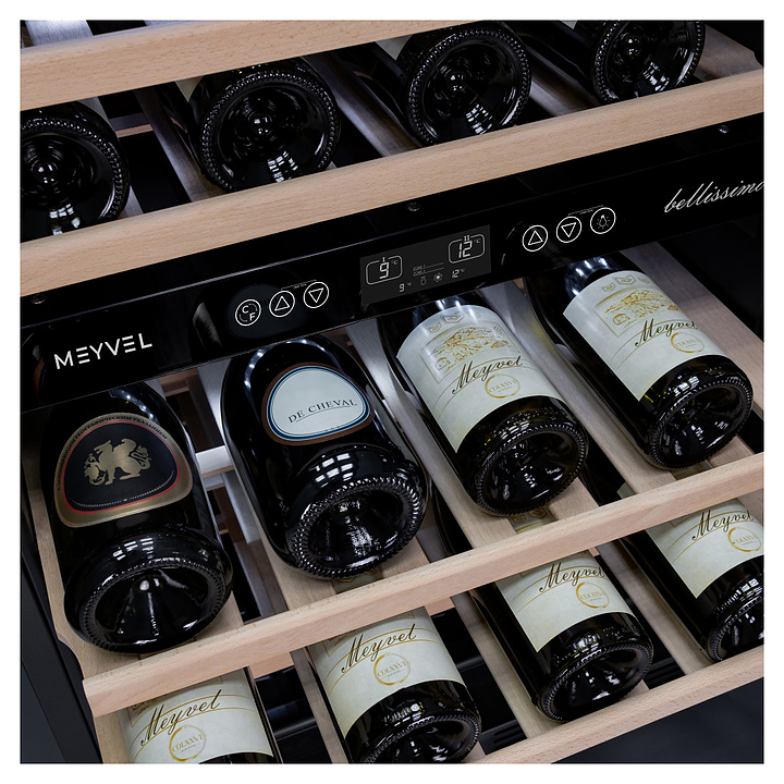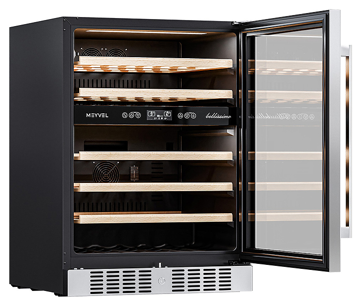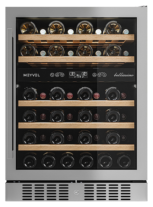 Винный шкаф MEYVEL MV46-KST2 предназначен для демонстрации, хранения и создания оптимальных условий для сохранения всех вкусовых свойств вина в бутылках на предприятиях общественного питания, торговли, в барах, ресторанах, специализированных магазинах, частных домах или квартирах. Модель оснащена сенсорной панелью управления, 2 электронными термостатами, замком и синей внутренней светодиодной подсветкой. Корпус выполнен из окрашенной в черный цвет стали, дверь - из двойного стекла с УФ защитой со стальной рамкой, полки - из массива бука. Особенности: