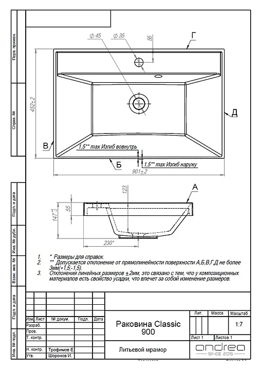 Раковина Andrea Classic 90 популярной российской компании легко вписывается в интерьер любой ванной комнаты. Встраиваемая конструкция позволяет экономить место в ванной комнате для хранения туалетных принадлежностей. Изделие выполнено из искусственного мрамора, который отличается высокой прочностью, стойкостью к химическим веществам и высокой температуре, а также имеет гладкую поверхность. В комплект поставки входит слив-перелив. Смеситель в комплект поставки не входит и приобретается отдельно. Особенности: