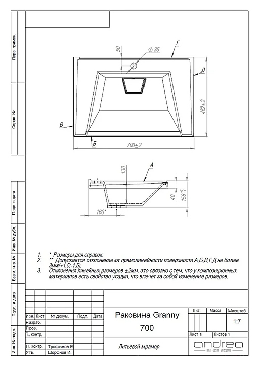 Раковина Andrea Granny 70 популярной российской компании легко вписывается в интерьер любой ванной комнаты. Встраиваемая конструкция позволяет экономить место в ванной комнате для хранения туалетных принадлежностей. Изделие выполнено из искусственного мрамора, который отличается высокой прочностью, стойкостью к химическим веществам и высокой температуре, а также имеет гладкую поверхность, а верхний слой гелькоута образует декоративно защитное покрытие. В комплект поставки входит декоративная крышка. Особенности: