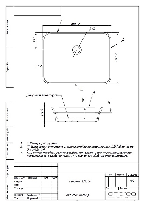 Раковина Andrea Effie 50 популярной российской компании легко вписывается в интерьер любой ванной комнаты. Накладная конструкция обеспечивает простую установку, экономит место и обеспечивает изящный внешний вид. Изделие выполнено из искусственного мрамора, который отличается высокой прочностью, стойкостью к химическим веществам и высокой температуре, а также имеет гладкую поверхность, а верхний слой гелькоута образует декоративно защитное покрытие. Особенности:
