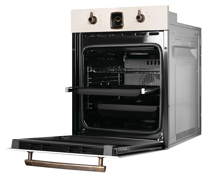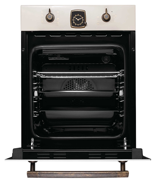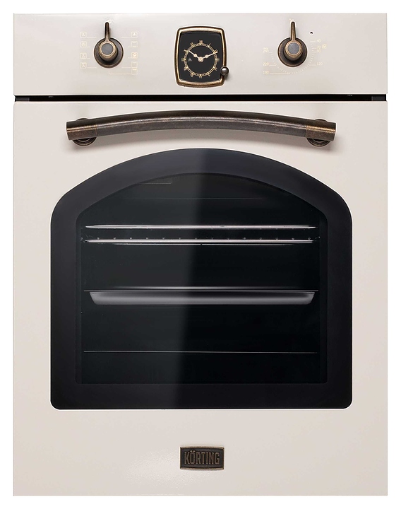 Электрический духовой шкаф Korting OKB 4941 CRB коллекции Calabria используется в квартирах и частных домах для приготовления широкого спектра блюд из овощей, мяса, птицы и рыбы, а также выпечки десертов и хлебобулочных изделий. Модель оснащена поворотными регуляторами, аналоговыми часами в ретро стиле, внутренним освещением с помощью галогенной лампы и шнуром питания с вилкой. Фронтальная поверхность выполнена из металла, регуляторы - из композитного материала. Комплектация: