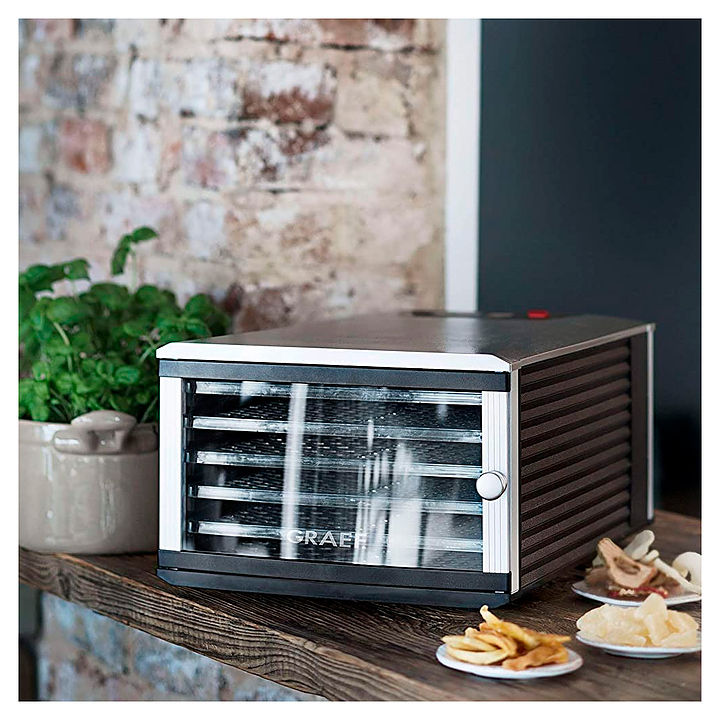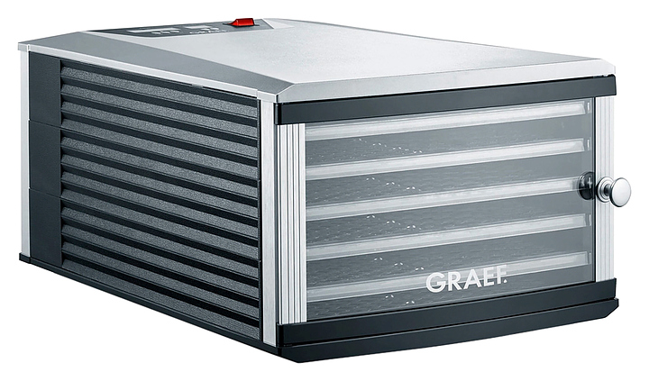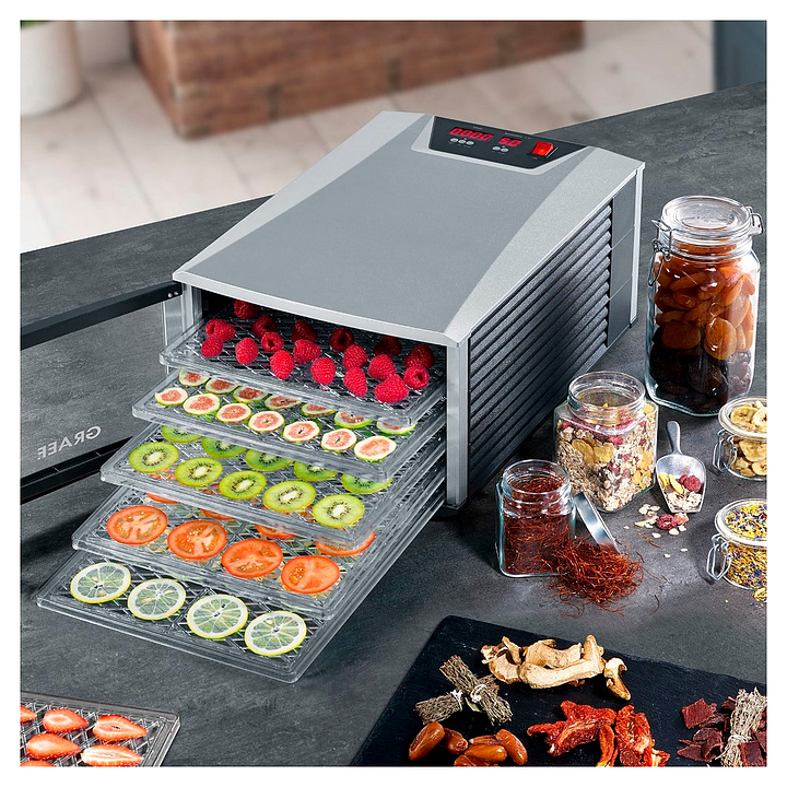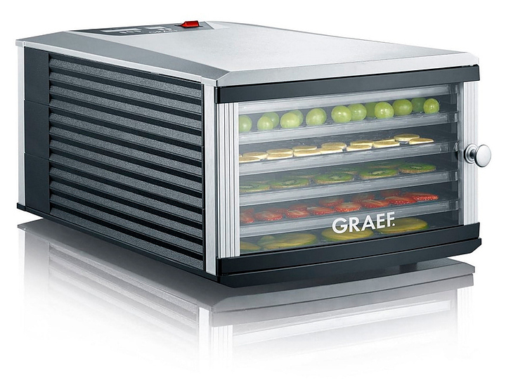 Сушилка для овощей и фруктов Graef DA 506 предназначена для быстрой и равномерной сушки фруктов, овощей, зелени и других продуктов в частных домах и квартирах. Модель оснащена панелью управления с дисплеем, отображающим данные температуры и таймера. Корпус выполнен из высококачественного пластика. В комплект поставки входят 6 лотков из пластика, не содержащего ВРА, и силиконовый коврик. Особенности:
