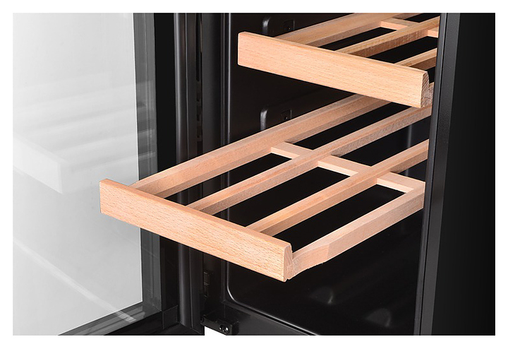 Винный шкаф MC Wine W46-2DB предназначен для кратковременного хранения вина при определенном уровне влажности и температуры в ресторанах, специализированных магазинах, отелях, подсобных складских помещениях, в частных домах или квартирах и подготовки вина к подаче на стол. Модель оснащена 2 дверями, сенсорным цифровым дисплеем и циферблатом, белой светодиодной подсветкой, светодиодным индикатором температуры, регулируемыми по высоте ножками и черной трубчатой ручкой. Двери выполнены из двухслойного низкоэмиссионного стекла с УФ-защитой, бесшовная рама и ручка - из нержавеющей стали, полки - из бука. Особенности: