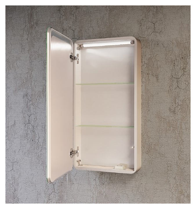 Зеркальный шкаф Raval Pure 46 дополнит интерьер ванной комнаты. Благодаря подвесной конструкции изделие не занимает много места, что экономит пространство и облегчает уборку. Модель имеет универсальную ориентацию и оснащена галогеновой подсветкой, распашной дверцей и 2 полками внутри. Корпус выполнен из влагостойкой МДФ в глянцевой пленке, фасад - из МДФ с глянцевым покрытием. Дополнительные характеристики: