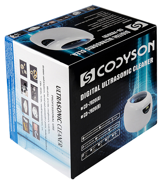Ультразвуковая мойка CODYSON CD-7820А используется в салонах красоты, косметологических центрах, парикмахерских, маникюрных студиях, ремонтных мастеских и домашних условиях для быстрой и эффективной очистки, а также бактерицидной обработки при эксплуатации с растворами не агрессивных моющих и дезинфицирующих средств поверхностей рабочих инструментов, очков, ювелирных изделий, монет, столовых приборов, компакт-дисков и предметов личной гигиены. Принцип работы основан на эффекте акустической кавитации: под воздействием высокочастотных колебаний в жидкой среде резервуара образуется и схлопывается множество пузырьков, возникающие при этом процессе ударные волны разрушают области загрязнений. Модель оснащена откидной крышкой, кабелем питания с вилкой и кнопочной панелью управления с цифровым светодиодным дисплеем. Корпус выполнен из ударопрочного АБС-пластика, резервуар овального сечения – из высококачественной нержавеющей стали SUS304. В комплект поставки входят инструкция по эксплуатации, съемные кабель питания и пластиковые решетчатая корзина для инструментов, подставка для наручных часов и держатель для компакт-дисков. Особенности: