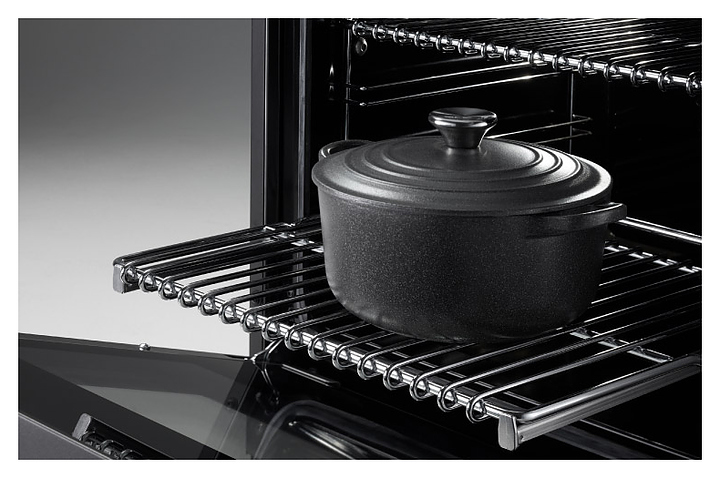 Варочный центр Bertazzoni HER95I1ENET предназначен для приготовления большого ассортимента блюд в гостиничном и ресторанном бизнесе, на предприятих пищевой промышленности, общественного питания и в домашних условиях. Модель оснащена индукционной варочной поверхностью с задним бортом, многофункциональным духовым шкафом с откидной дверью и обзорным окном, вентилятором, выдвижным ящиком для хранения инвентаря, термощупом, сенсорной панелью управления с электронным программатором, 7 рукоятками управления и фирменным аналоговым термометром. Ножки выполнены из нержавеющей стали, переключатели – из твердосплавного металла. В комплект поставки входят 2 хромированные решетки, эмалированный противень и подставка-гриль для лотка. Режимы работы духового шкафа: