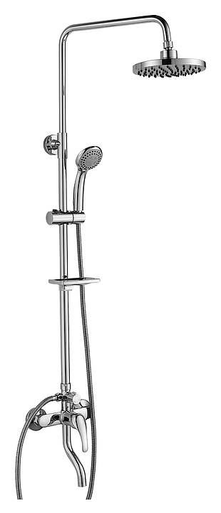 Душевая стойка Rossinka A35-46 используется в ванных комнатах. Модель оснащена полочкой для размещения аксессуаров, круглыми верхним душем и лейкой. Керамический картридж обеспечивает плавный ход рычага смесителя, контроль и точность при выборе напора и температуры воды. Аэратор уменьшает шум, снижает количество брызг и оснащен функцией легкой очистки. Изделие выполнено из латуни, которая отличается прочностью, долговечностью и устойчивостью к перепадам температур, рукоятка - из металла, аэратор - из пластика. В комплект поставки входят шланг, лейка, крепление для лейки, полка и эксцентрики с отражателями. Особенности: