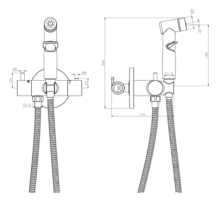 Гигиенический душ Rossinka X25-58 предназначен для использования в туалетных комнатах. Термостатический картридж с функцией регулировки потока обеспечивает подачу воды заданной температуры, что исключает ожоги. Изделие выполнено из латуни, которая отличается прочностью, долговечностью и устойчивостью к перепадам температуры, рукоятка - из металла. В комплект поставки входят лейка гигиенического душа и шланг. Особенности: