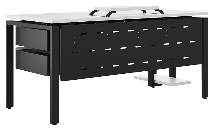 Офисный стол Кобор P-80/80 black/premium используется в офисных помещениях и кабинетах руководителей. Модель оснащена П-образными опорами. Каркас выполнен из металла, выкрашенного в цвет черный муар (RAL9005), столешница – из ламинированной древесно-стружечной плиты (ЛДСП) цвета белый премиум (W1000 S9). Опции (заказываются отдельно):