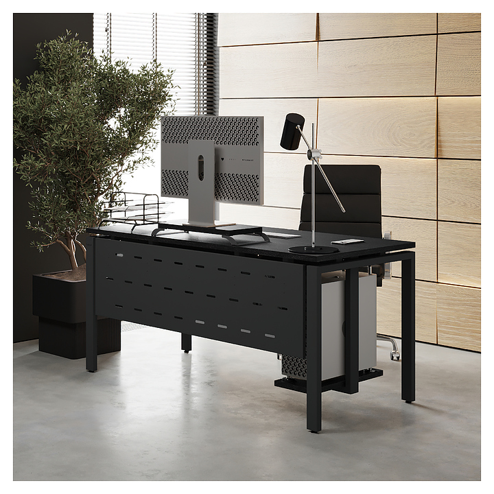 Офисный стол Кобор P-160/80 black/glazed используется в офисных помещениях и кабинетах руководителей. Модель оснащена П-образными опорами. Каркас выполнен из металла, выкрашенного в цвет черный муар (RAL9005), столешница – из ламинированной древесно-стружечной плиты (ЛДСП) цвета черный дуб (H3178 ST37). Опции (заказываются отдельно):