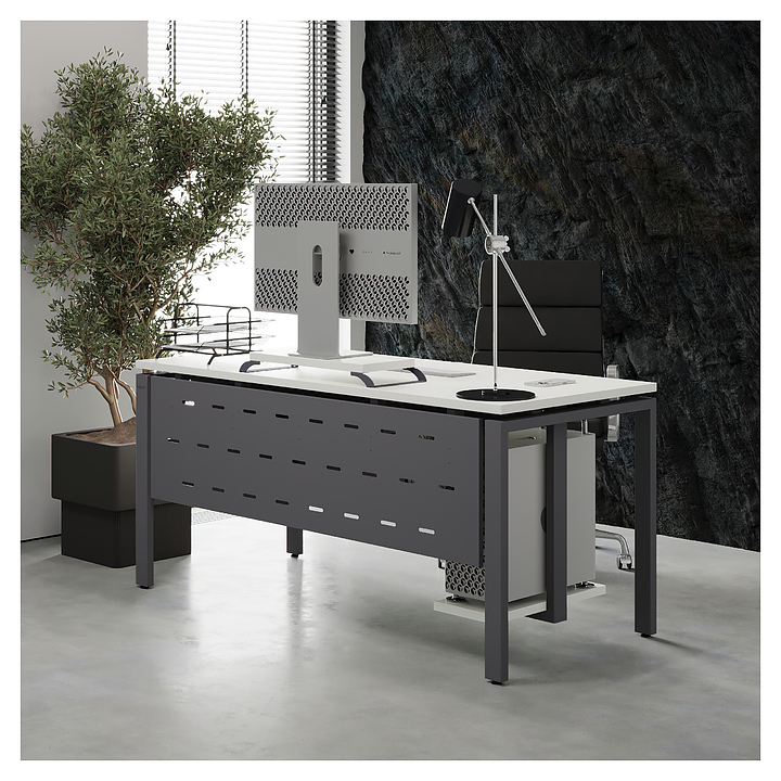 Офисный стол Кобор P-160/80 graphite/premium используется в офисных помещениях и кабинетах руководителей. Модель оснащена П-образными опорами. Каркас выполнен из металла, выкрашенного в цвет графит муар (RAL7024), столешница – из ламинированной древесно-стружечной плиты (ЛДСП) цвета белый премиум (W1000 ST9). Опции (заказываются отдельно):